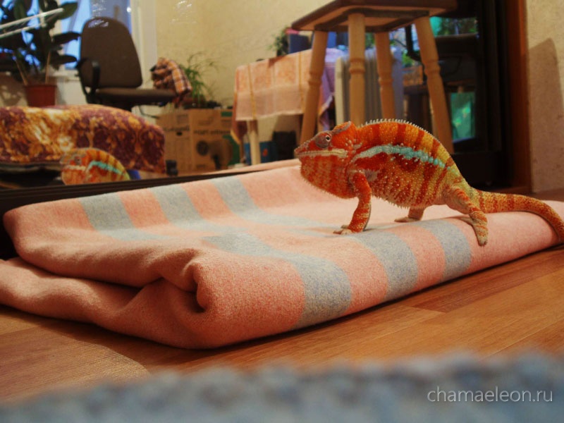 Давайте поделимся, как наши хамелеоны реагируют на зеркало. Точнее, на своё отражение в зеркале. (конечно, оборудовать террариум зеркалами никто не предлагает). Мой Махмуд (йеменский) после того как самка забеременела и отложила яйца не трогал её, хотя иногда "семафорил", но как-то недолго и неубедительно (они живут совместно). Сейчас он размером почти в два раза больше неё, если и раньше нападал то как он её своей "клешнёй" хватанёт, я ж переживал чтоб у неё рёбра остались целы. Спустя почти два месяца от первых брачных игр сидели спокойно, самка предпочитала его обходить, но иногда даже под лампой грелись вместе. На днях я взял Махмуда (точнее, заманил толстой белой личинкой себе на руку) и прогулялся по квартире. Увидев своё отражение в зеркале он ТАК ЗАСЕМАФОРИЛ как никогда раньше. Надулся совсем как "узбецкий патир-липёщкя" весь напрягся и прям чуть не засветился. Когда я его запустил обратно в террариум он стремглав аж спотыкаясь побежал к самке и в рекордном темпе повторил весь брачный ритуал.